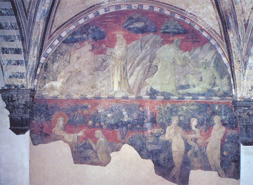 Сотворение Адама и земных животныхВ родную Флоренцию Уччелло возвратился не позднее января 1431 года, о чем говорит дата на квитанции об уплате художником налогов. В начале следующего года мастер предложил флорентийским властям свои «услуги» по оформлению кафедрального собора. Власти не сразу доверились ему, а 23 марта 1432 года обратились к своему представителю в Венеции с просьбой собрать для них сведения о Паоло Уччелло. Судя по всему, полученный из Венеции отзыв оказался благоприятным, поскольку в 1436 году живописец приступил к созданию большой фрески в кафедральном соборе. Эта фреска, на которой изображен памятник сэру Джону Хоквуду, английскому рыцарю, сражавшемуся в XIV столетии в рядах флорентийской армии, - первая из дошедших до нас точно документированных работ Уччелло.В 1445-46 годах Уччелло побывал в Падуе. Согласно Вазари, он поехал туда по приглашению своего друга, скульптора Донателло, нашедшего для художника выгодный заказ. Увы, сегодня невозможно отыскать и следов серии фресок, созданной мастером для падуанского дворца Витальяни. Более того, не осталось даже письменных источников, где хоть сколько-нибудь подробно описывались бы эти фрески. О них упоминает лишь Вазари, и то мельком. В 1446 году Уччелло возвратился во Флоренцию и, как следует из заполненной им тогда же налоговой декларации, поселился на виа делла Скала, рядом с церковью Всех Святых. В этом же году он женился, хотя мы не располагаем сведениями о точной дате его венчания (церковные записи были утрачены). В 1453 году жена Уччелло, Томмаза, разрешилась от бремени сыном Донато, а в 1456 году умерла после неудачных родов. Девочка, появившаяся на свет, выжила, и ее нарекли Антонией. Недолгая семейная жизнь художника была, по всей видимости, довольно благополучной. Об этом нам позволяет судить «анекдот», рассказанный Вазари в «Жизнеописаниях знаменитых живописцев». Однажды Уччелло до поздней ночи засиделся над изучением перспективы. Когда, наконец, жена позвала его идти спать, мастер улыбнулся и воскликнул: «Пожалуй, такая перспектива мне нравится больше всего». О своеобразном юморе художника свидетельствует и такая история (ее тоже поведал потомкам Вазари). Работая над фресками для флорентийского монастыря Сан-Миниато аль Монте, Уччелло питался изо дня в день одним только сухим хлебом и козьим сыром - поскольку ничего другого скупой настоятель монастыря не предлагал живописцу. Такой рацион вскоре надоел ему, и он ушел из монастыря, оставив фрески недописанными.